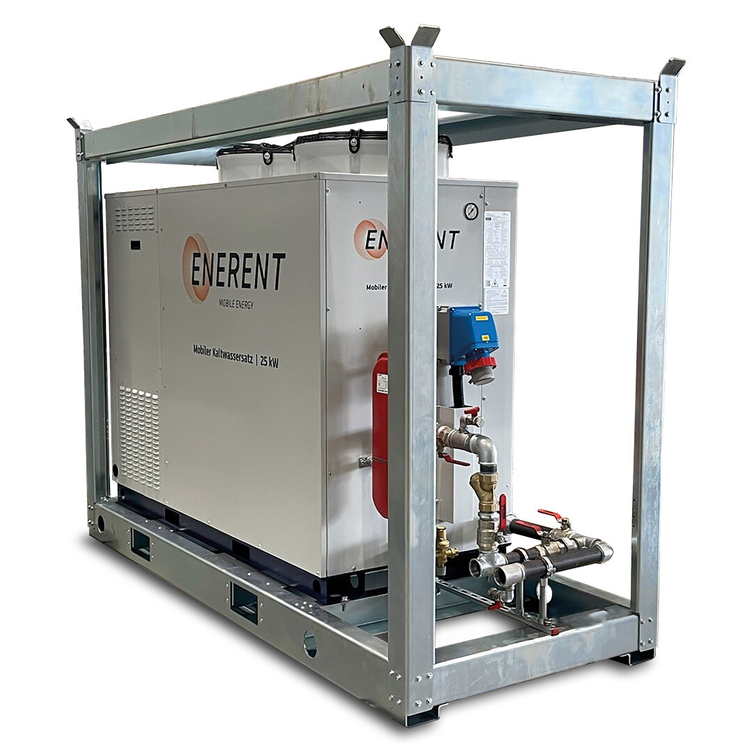 Die mobile Kältezentrale ERKZE25 ist ein moderner Kaltwassersatz mit einer Kühlleistung von 25 kW. Sie eignet sich ideal für den flexiblen Einsatz bei temporären Kühlaufgaben und überzeugt durch ihre kompakte Bauweise sowie wartungsarme Technik.